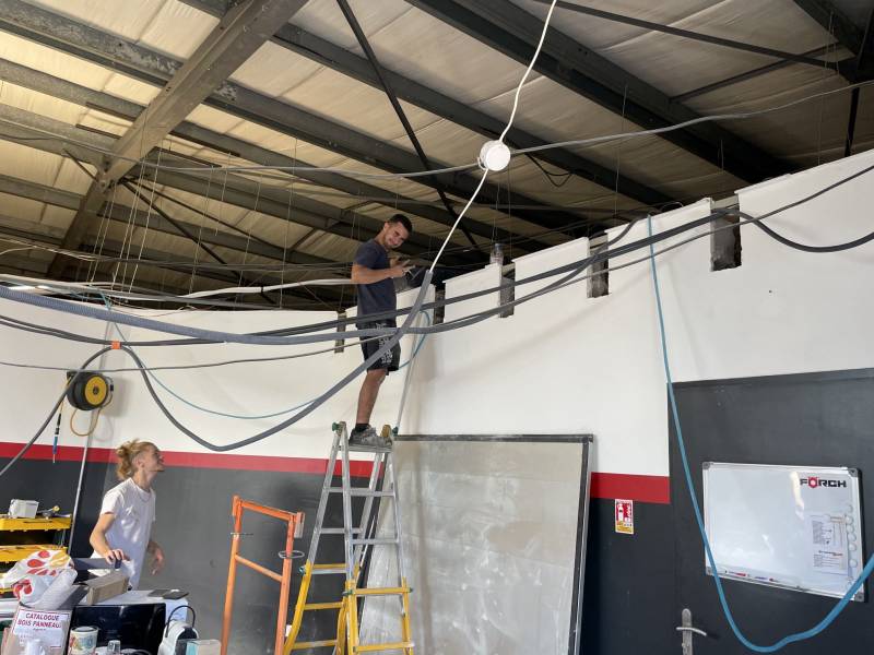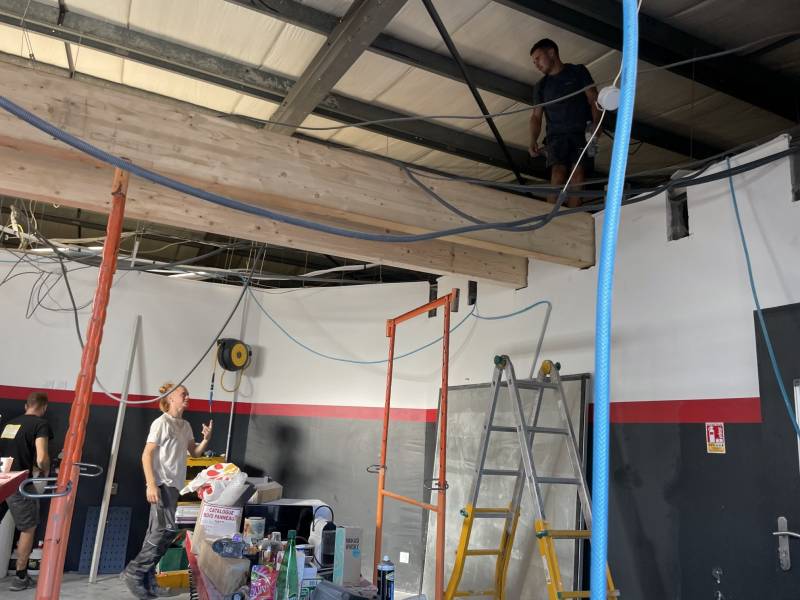 On a pu optimiser la hauteur du plafond, nous avons créé un plancher pour la mezzanine isolé par la fibre de bois pour optimiser l'isolation du lieu. Pour le support des charges lourdes, nous avons posé les poutres en lamellé collé.