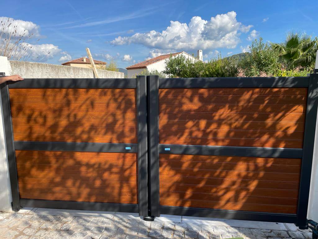 Portail en aluminium thermolaqué deux teintes, gris anthracite 7016 sablé et imitation bois sur mesure et motorisé.