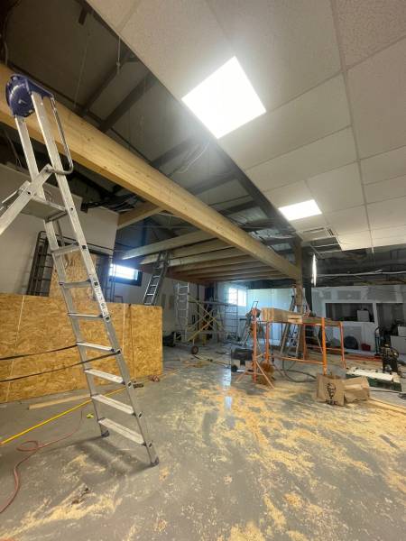 Fabrication de cloisons en ossature bois et OSB sur la mezzanine.