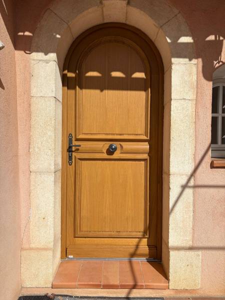 Fourniture et pose d'une porte d'entrée sur mesure en bois massif avec arc plein cintre (Chêne lasuré).