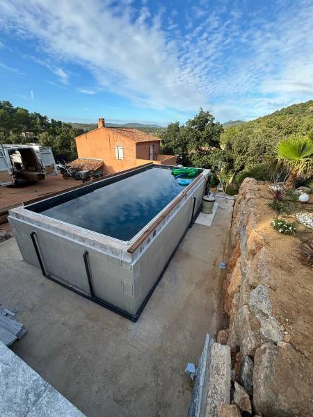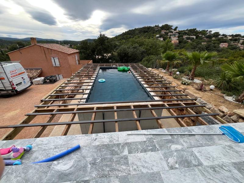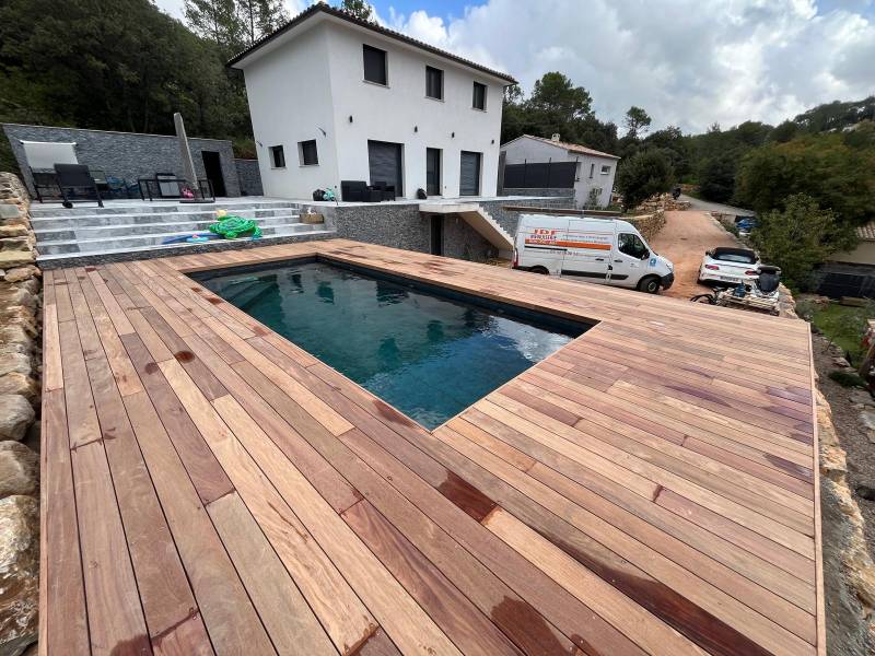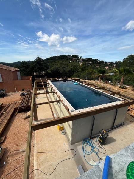 Fabrication d'une terrasse à Garéoult en bois exotique autour d'une piscine hors sol en béton banché, l'ossature et composé de pin classe 4 autoclave de section 70 mm x 220 mm scellées au mortier chimique dans le béton de la piscine puis vient la structure en 45 mm x 95 mm posées sur sabots en acier galvanisés avant le lambourdages en bois exotique.