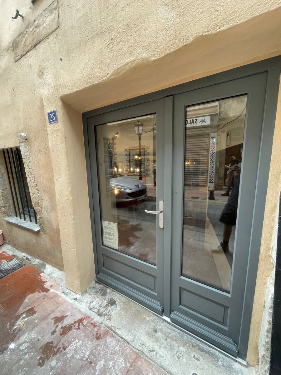 Pose d'une vitrine en bois marque REVEAU pour une salle de jeux de rôle à Brignoles en remplacement d'une porte fenêtre simple vitrage.